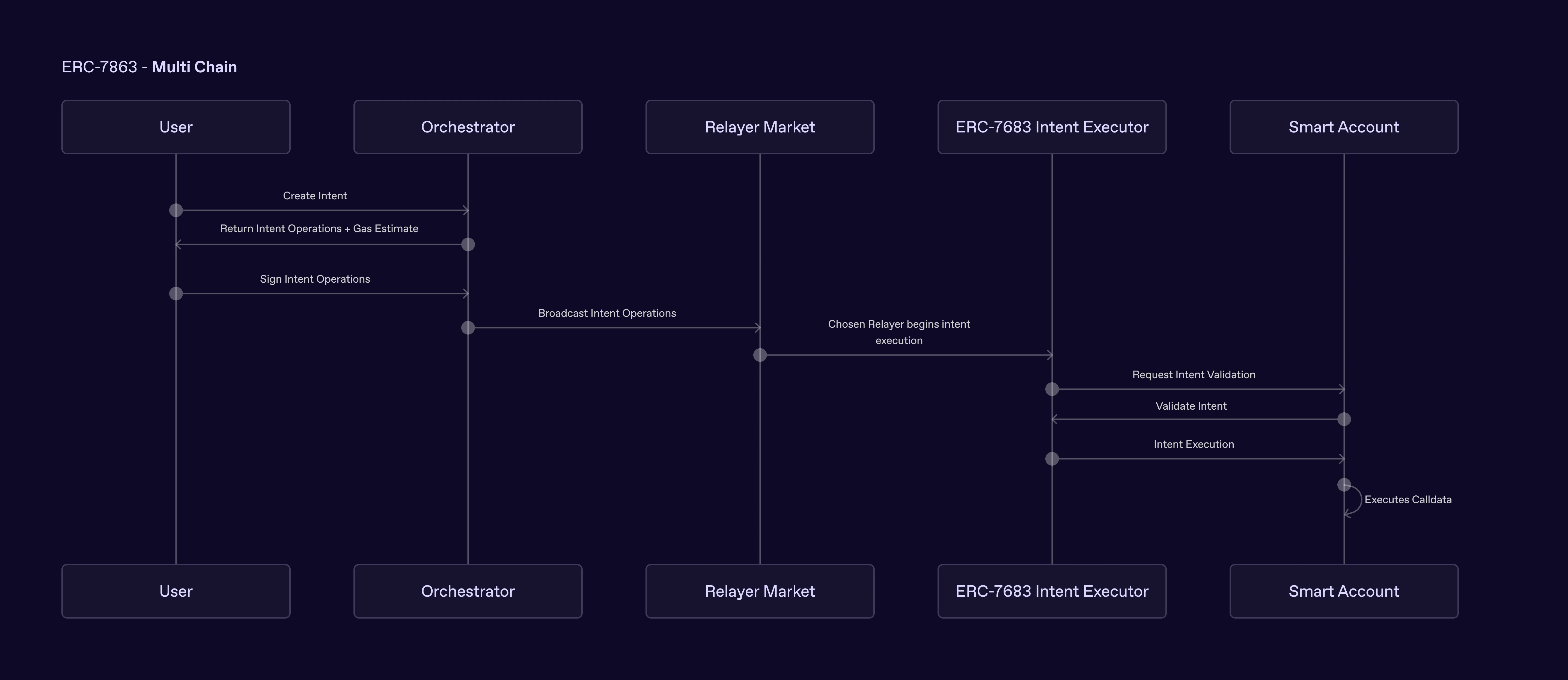 ERC-4337 introduced userops: pseudo-transactions handled by bundlers that relay smart account transactions onchain. Bundlers front the gas and submit through the EntryPoint contract, which orchestrates validation and execution via the smart account. Intents extend this model to crosschain transactions. An intent is a signed declaration of what the user wants to happen, which chains are involved, and which tokens they’re spending. A solver fulfils it, fronting gas and liquidity across all chains involved. The same model as a bundler and paymaster, but capable of spanning multiple chains in a single signed operation.Intents vs ERC-4337